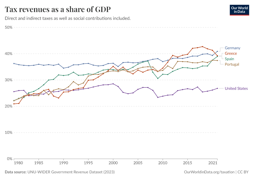 “Data Page: Tax revenues as a share of GDP”, part of the following publication: Esteban Ortiz-Ospina and Max Roser (2016) - “Taxation”. Data adapted from UNU-WIDER. Retrieved from https://edit-mdim.owid.pages.dev:8789/20260105-133053/grapher/tax-revenues-as-a-share-of-gdp-unu-wider.html [online resource] (archived on January 5, 2026).How to cite this data