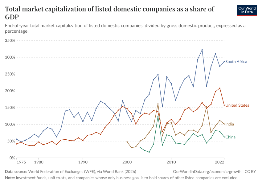 “Data Page: Total market capitalization of listed domestic companies as a share of GDP”. Our World in Data (2026). Data adapted from World Federation of Exchanges (WFE), via World Bank. Retrieved from https://edit-mdim.owid.pages.dev:8789/20260202-181317/grapher/total-market-capitalization-listed-domestic-companies-share-gdp.html [online resource] (archived on February 2, 2026).How to cite this data
