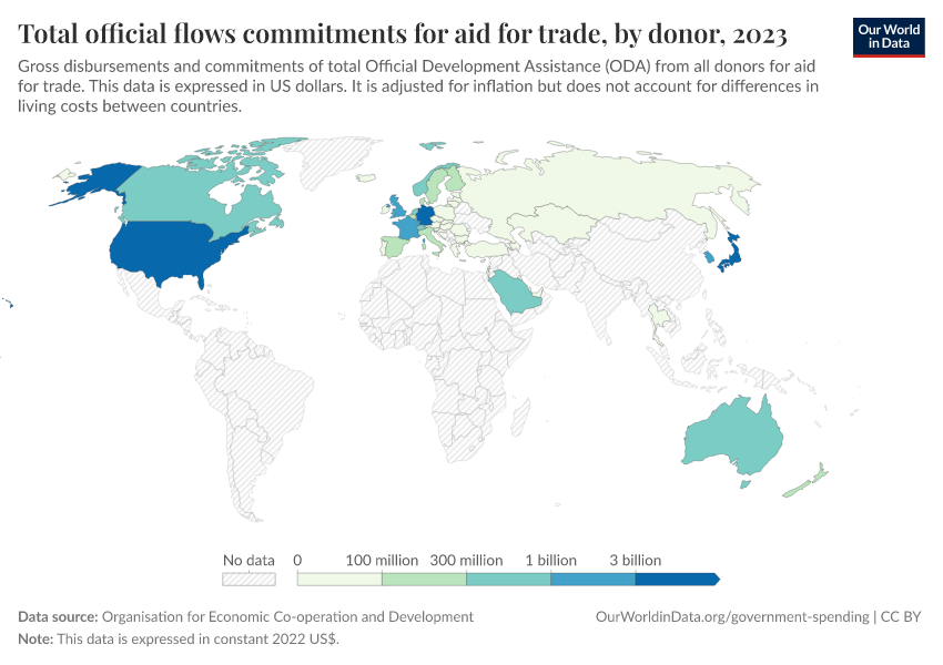 “Data Page: Total official flows commitments for aid for trade, by donor”. Our World in Data (2026). Data adapted from Organisation for Economic Co-operation and Development. Retrieved from https://edit-mdim.owid.pages.dev:8789/20251120-211038/grapher/total-oda-for-aid-for-trade-by-donor.html [online resource] (archived on November 20, 2025).How to cite this data