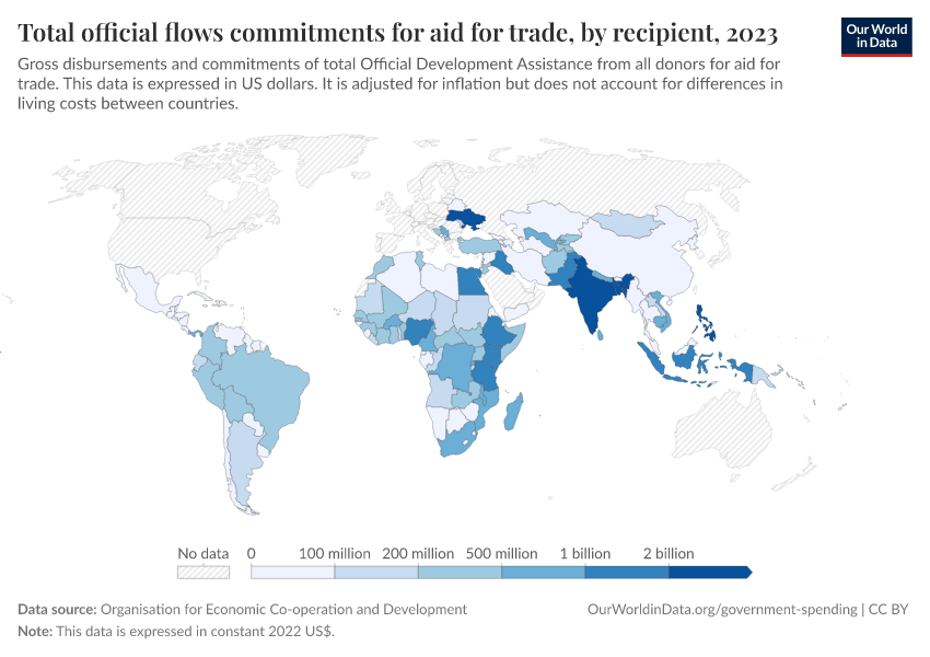 “Data Page: Total official flows commitments for aid for trade, by recipient”. Our World in Data (2026). Data adapted from Organisation for Economic Co-operation and Development. Retrieved from https://edit-mdim.owid.pages.dev:8789/20260130-180113/grapher/total-oda-for-aid-for-trade-by-recipient.html [online resource] (archived on January 30, 2026).How to cite this data