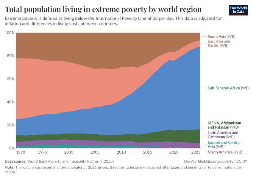 World Bank Poverty and Inequality Platform (2025) – with major processing by Our World in Data. “Total population living in extreme poverty by world region – World Bank” [dataset]. World Bank Poverty and Inequality Platform, “World Bank Poverty and Inequality Platform (PIP) 20250930_2021, 20250930_2017” [original data]. Retrieved February 24, 2026 from https://edit-mdim.owid.pages.dev:8789/20260127-114142/grapher/total-population-living-in-extreme-poverty-by-world-region.html (archived on January 27, 2026).