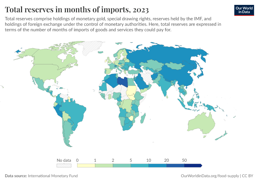 “Data Page: Total reserves in months of imports”. Our World in Data (2026). Data adapted from International Monetary Fund. Retrieved from https://edit-mdim.owid.pages.dev:8789/20260130-180113/grapher/total-reserves-in-months-of-imports.html [online resource] (archived on January 30, 2026).How to cite this data