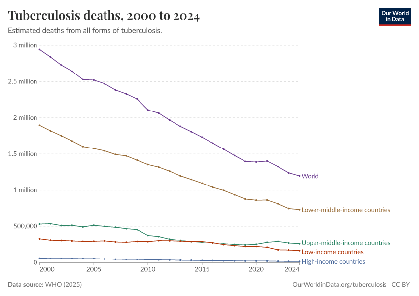 WHO (2025) – with minor processing by Our World in Data. “Tuberculosis deaths” [dataset]. WHO, “Global Tuberculosis Report - Burden Estimates” [original data]. Retrieved February 24, 2026 from https://edit-mdim.owid.pages.dev:8789/20260205-170810/grapher/tuberculosis-deaths-who.html (archived on February 5, 2026).