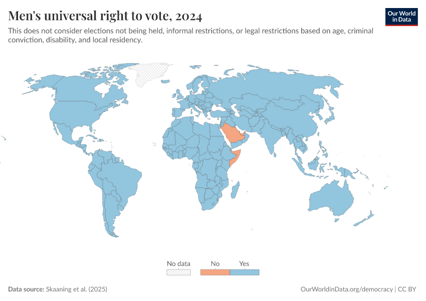 “Data Page: Men's universal right to vote”, part of the following publication: Bastian Herre, Lucas Rodés-Guirao, and Esteban Ortiz-Ospina (2013) - “Democracy”. Data adapted from Skaaning et al.. Retrieved from https://edit-mdim.owid.pages.dev:8789/20260119-065148/grapher/universal-suffrage-men-lexical.html [online resource] (archived on January 19, 2026).How to cite this data