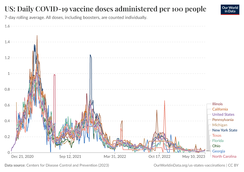 Centers for Disease Control and Prevention (2023) – processed by Our World in Data. “US: Daily COVID-19 vaccine doses administered per 100 people” [dataset]. Centers for Disease Control and Prevention, “COVID-19, Vaccinations (United States)” [original data]. Retrieved February 24, 2026 from https://edit-mdim.owid.pages.dev:8789/20250909-093708/grapher/us-daily-covid-vaccine-doses-per-100.html (archived on September 9, 2025).