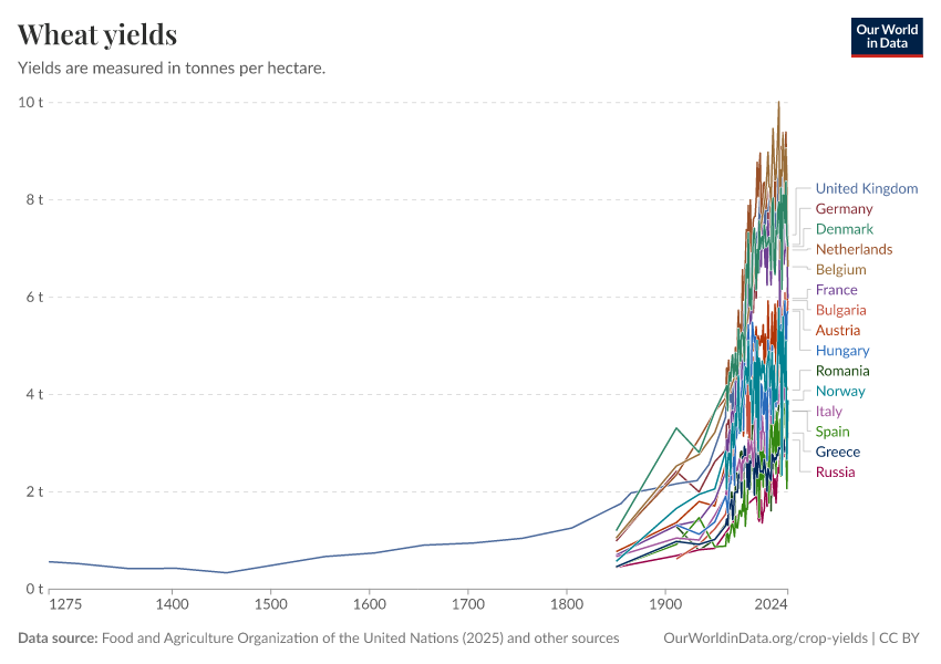 Food and Agriculture Organization of the United Nations (2025); Broadberry et al. (2015); Brassley (2000); Bayliss-Smith & Wanmali (1984) – with major processing by Our World in Data. “Wheat yields” [dataset]. Food and Agriculture Organization of the United Nations, “Production: Crops and livestock products”; Broadberry et al., “Long-term crop yields in UK”; Brassley, “Long-term crop yields in UK”; Bayliss-Smith & Wanmali, “Understanding Green Revolutions” [original data]. Retrieved February 24, 2026 from https://edit-mdim.owid.pages.dev:8789/20260116-143329/grapher/wheat-yields.html (archived on January 16, 2026).