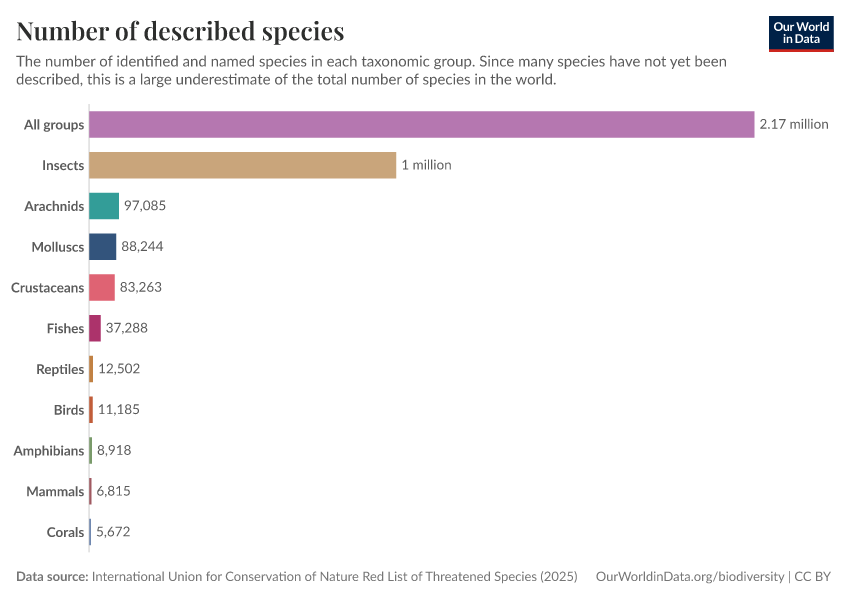 Hannah Ritchie (2022) - “How many species are there?” Published online at OurWorldinData.org. Retrieved from: 'https://edit-mdim.owid.pages.dev:8789/20260106-083806/how-many-species-are-there.html' [Online Resource] (archived on January 6, 2026).BibTeX citation