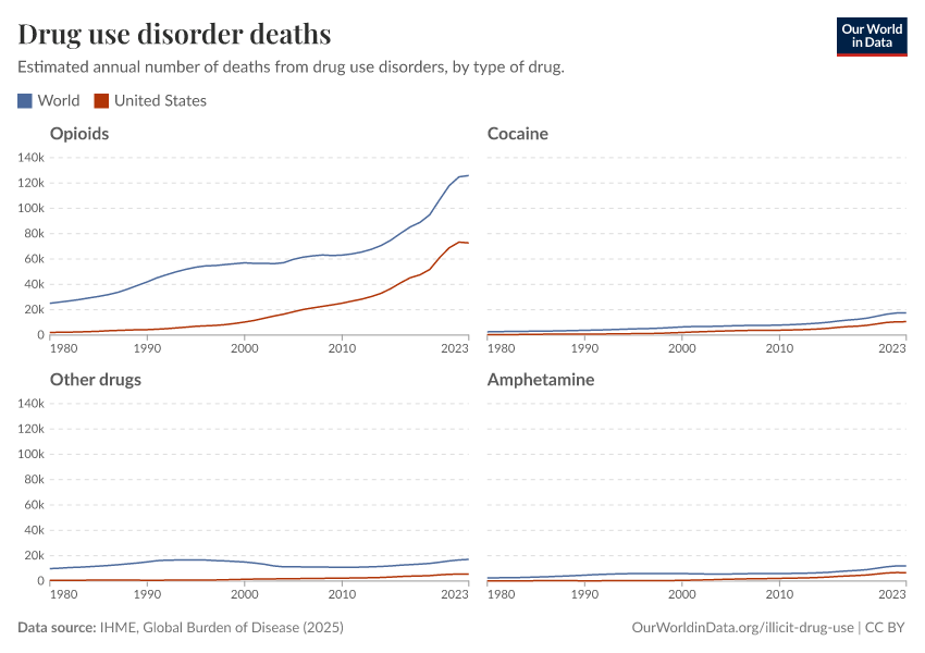 Hannah Ritchie, Pablo Arriagada, and Max Roser (2022) - “Opioids, Cocaine, Cannabis, and Other Illicit Drugs” Published online at OurWorldinData.org. Retrieved from: 'https://edit-mdim.owid.pages.dev/illicit-drug-use' [Online Resource]BibTeX citation