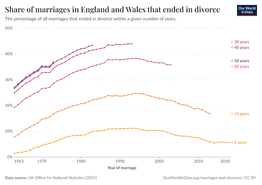 In the chart here we show the percentage of marriages that ended in divorce in England and Wales since 1963. This is broken down by the number of years after marriage – that is, the percentage of couples who had divorced five, ten, twenty, thirty, and forty years after they got married.