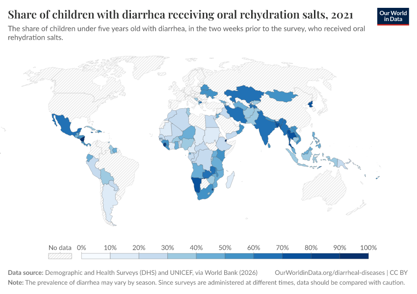 The map below shows the share of children under the age of 5 who received diarrheal treatment in the form of oral rehydration salts.
