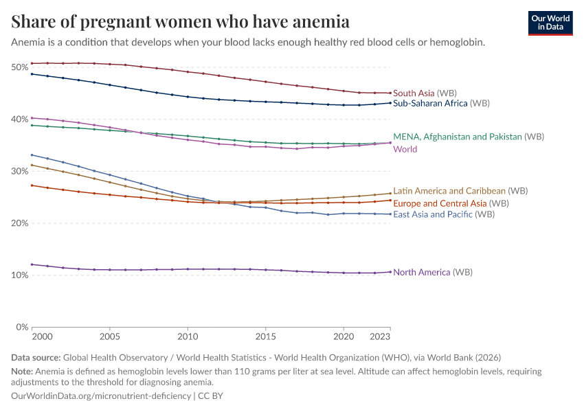 In the chart, we see the prevalence of anemia in pregnant women. Globally, around a third of pregnant women worldwide are anemic.