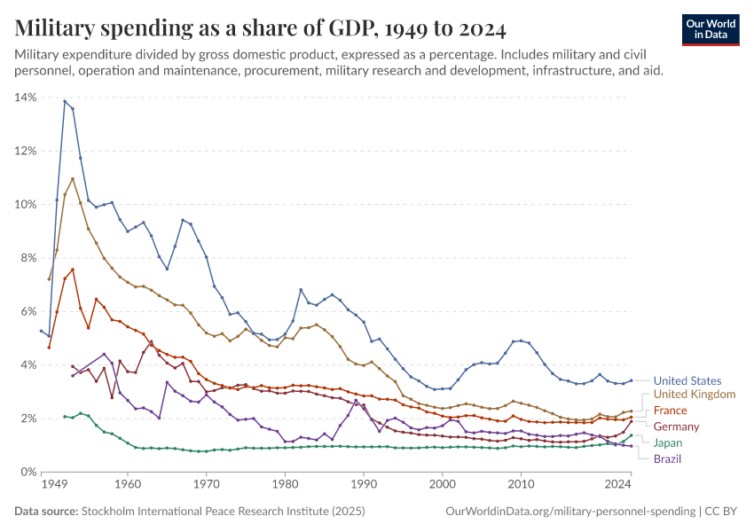 This chart shows military spending as a share of GDP for several countries. We see that since the end of the Second World War, there is a broad negative trend in military budget shares across world regions.