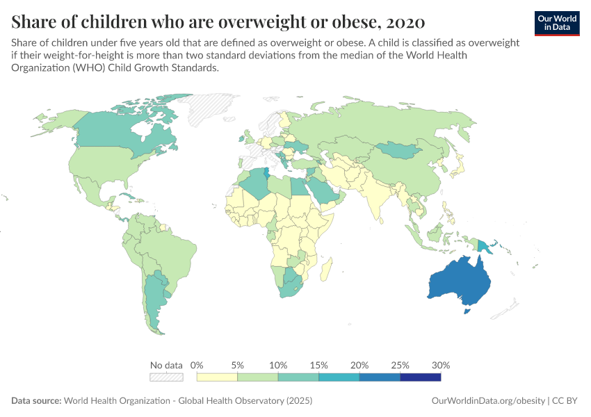 We also provide data on the share of adults that are either overweight or obese. This means having a BMI equal to or greater than 25.