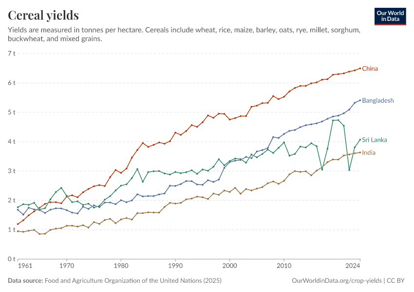 I’ve written previously about the benefits of agricultural technologies such as fertilizers, better seeds, pesticides, and irrigation for food production, poverty alleviation, and sparing natural habitat. These technologies have played a massive role in the dramatic rise in crop yields seen in countries like Sri Lanka, India, China, and Bangladesh. See the chart below.