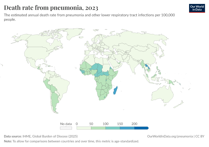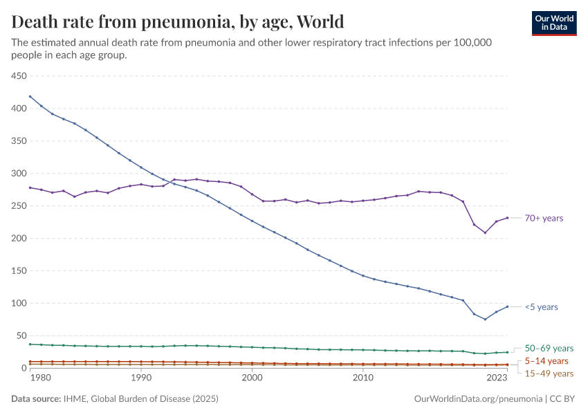 Bernadeta Dadonaite and Max Roser (2019) - “Pneumonia” Published online at OurWorldinData.org. Retrieved from: 'https://edit-mdim.owid.pages.dev/pneumonia' [Online Resource]BibTeX citation