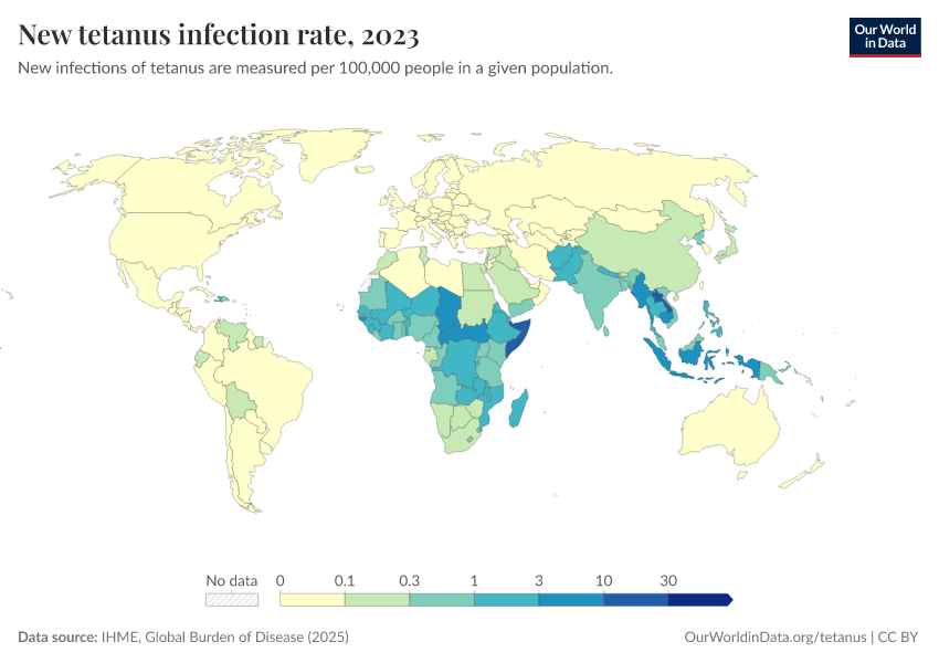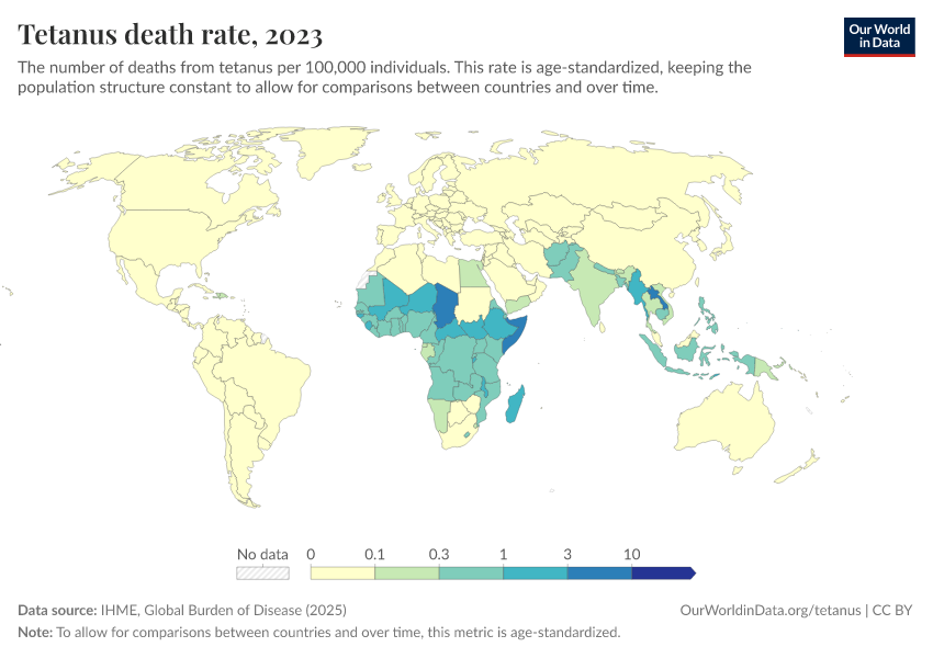 Hannah Behrens, Sophie Ochmann, Bernadeta Dadonaite, and Max Roser (2019) - “Tetanus” Published online at OurWorldinData.org. Retrieved from: 'https://edit-mdim.owid.pages.dev/tetanus' [Online Resource]BibTeX citation