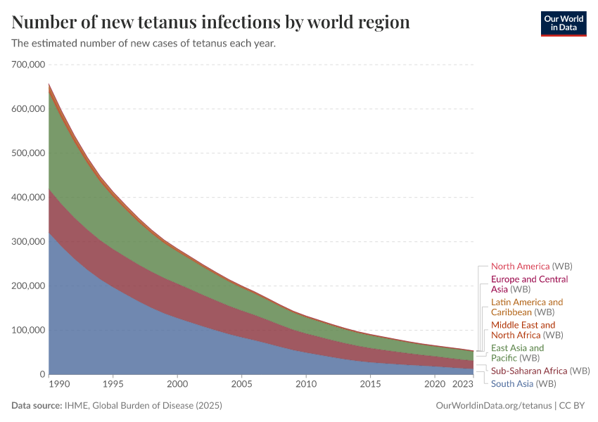 However, even though South Asia still sees more cases of tetanus than any other region, in just three decades the number of new infections has fallen massively, from close to 400,000 infections in 1990 to around 30,000 in 2019.