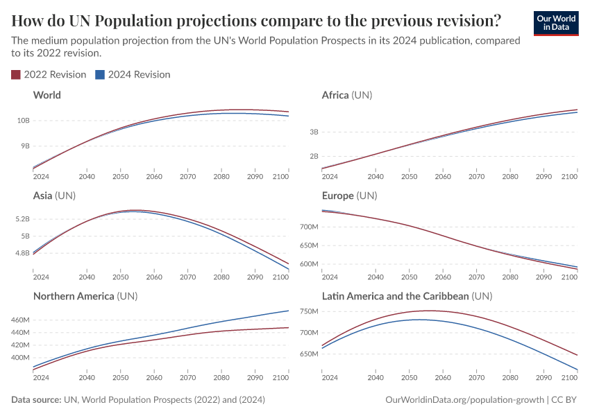 Not every country has seen a drop in projected population compared to the last edition. The chart below shows the differences between the two UN revisions, region by region. Note that the vertical axis scale for each region is different, allowing you to see the changes more clearly.
