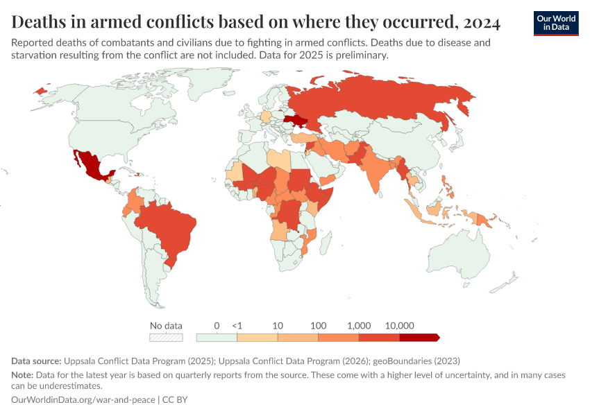 Bastian Herre, Lucas Rodés-Guirao, and Max Roser (2024) - “War and Peace” Published online at OurWorldinData.org. Retrieved from: 'https://edit-mdim.owid.pages.dev/war-and-peace' [Online Resource]BibTeX citation