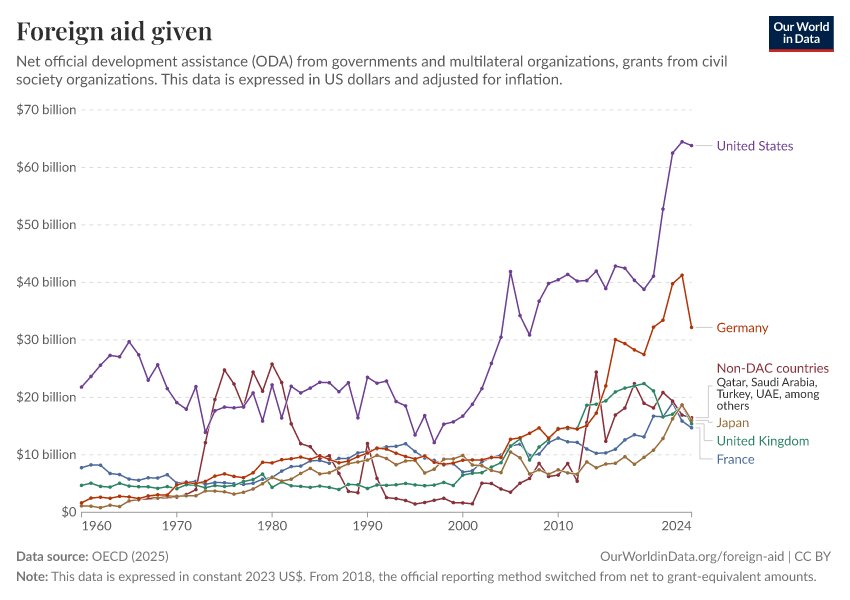 Simon van Teutem and Pablo Arriagada (2025) - “What is foreign aid? How “Official Development Assistance” is measured” Published online at OurWorldinData.org. Retrieved from: 'https://edit-mdim.owid.pages.dev:8789/20260223-070107/what-is-foreign-aid.html' [Online Resource] (archived on February 23, 2026).BibTeX citation