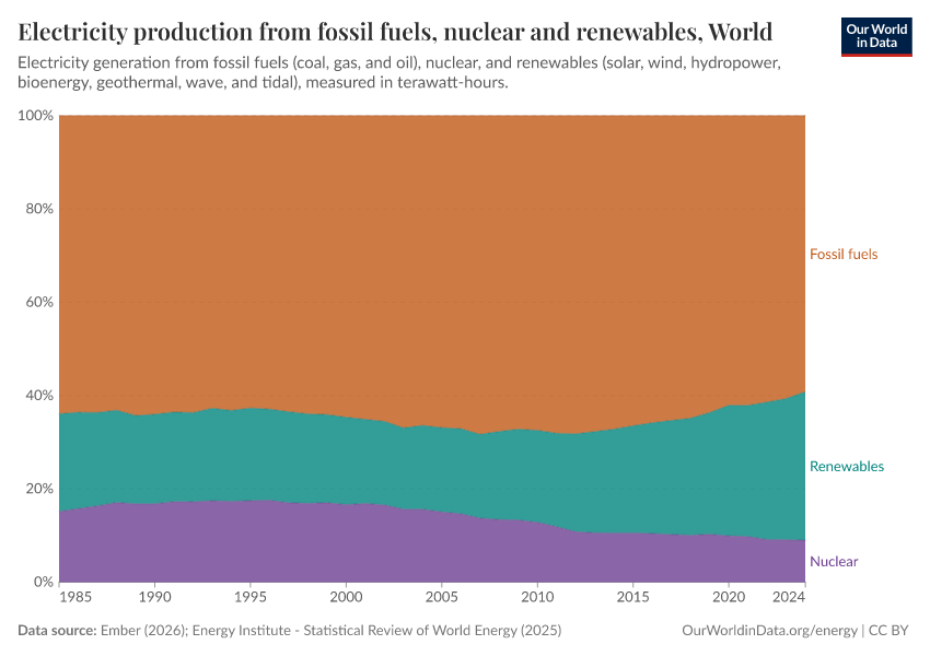 One sector where we have developed several alternatives to fossil fuels is electricity. Nuclear power and renewables emit far less carbon (and are much safer) than fossil fuels. Still, as the last chart shows, their share in global electricity production hasn't changed much: only increasing from 37% to 41% over the last three decades.